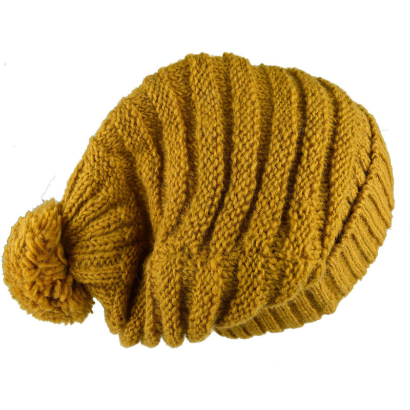 Bonnet femme laine maille tricotée, doublé polaire, chaud et confortable avec pompon Moutarde.