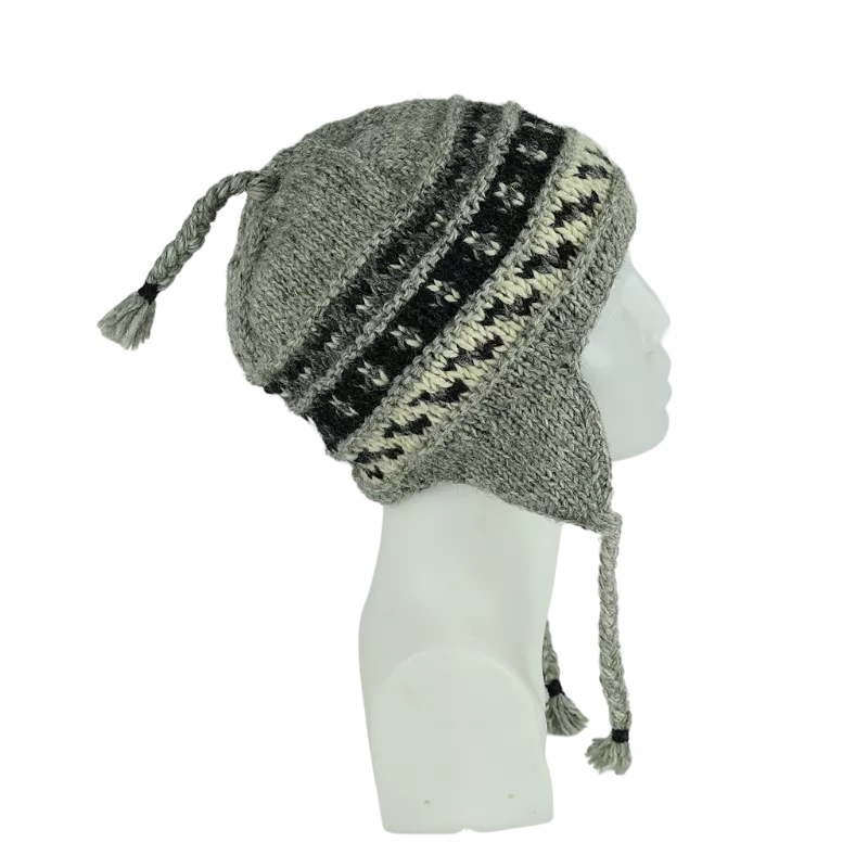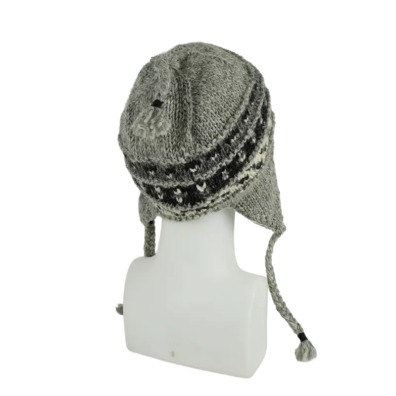 Bonnet Péruvien laine maille tricotée ton gris clair et multicolore, doublé polaire douce et épaisse.