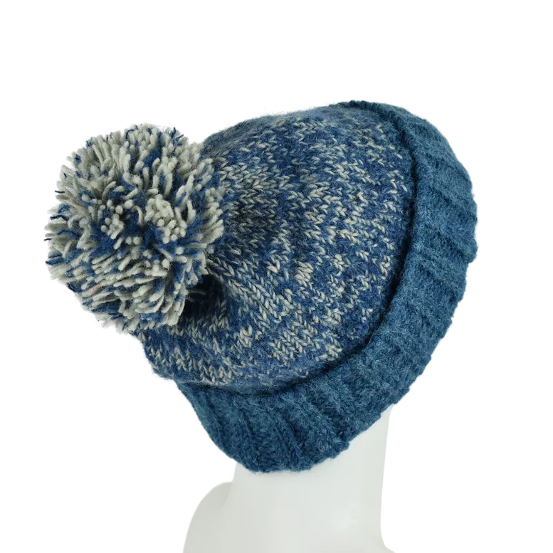 Un bonnet ton chiné gris et bleu tricot laine mixte doublé polaire, chaud essentiel pour le froid.