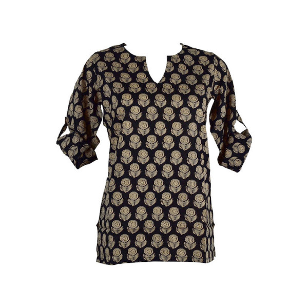 Blouse en Coton imprimé dans une tendance décontractée et originale imprimé gulab beige sur fond noir avec manches réglables.