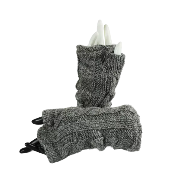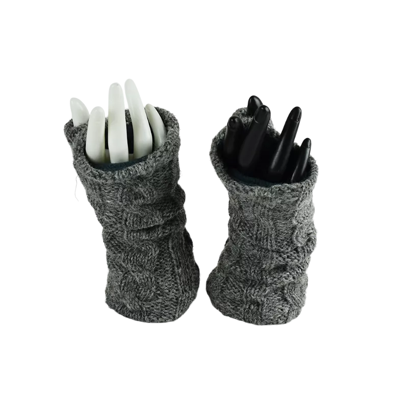 Mitaines longues en laine tricotée avec motif tressé ton gris foncé, doublées en polaire douce. Pratique pour les activités extérieures en gardant une partie de sa main au chaud.