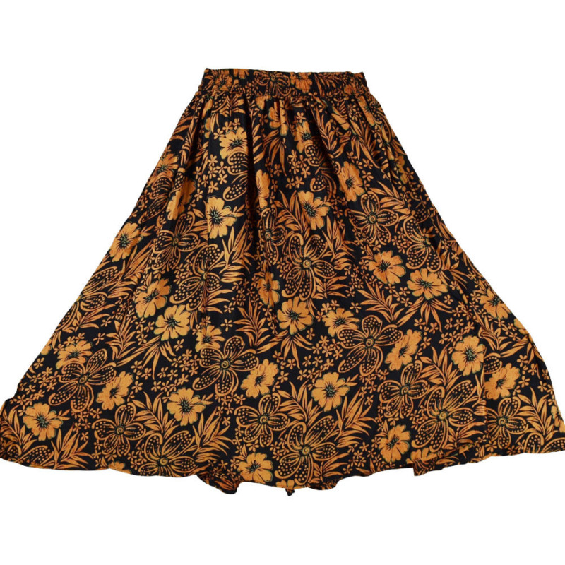 Jupe mi longue en polysilk imprimé floral couleur ocre sur fond noir.
