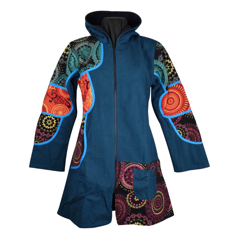 Découvrez ce manteau femme en toile canvas bleu pétrole, alliant confort et style. Sa capuche pratique protège des intempéries, tandis que les empiècements imprimés ethniques ajoutent une touche d'originalité. Parfait pour les journées fraîches, ce manteau est un incontournable de la saison !