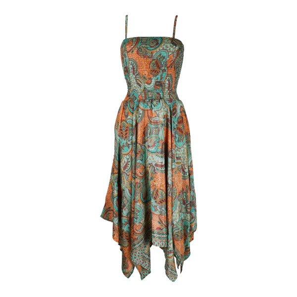 Voir les caractéristiques de cette robe mi-longue en soie asymétrique et ethnique :