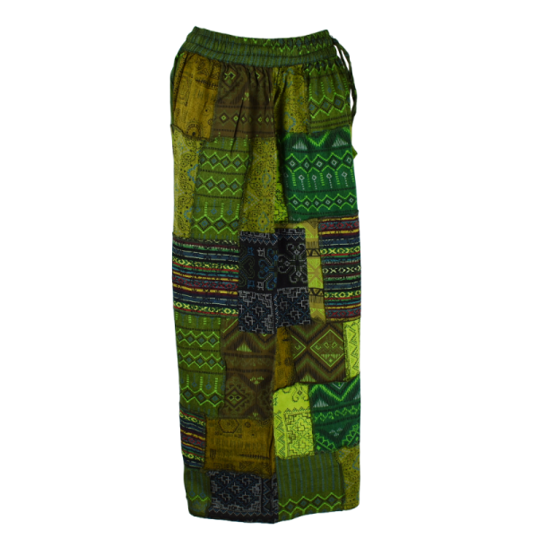 Ce pantalon femme se distingue par sa coupe ample inspirée du modèle "patte d'éléphant", offrant une liberté de mouvement incomparable. Son tissu patchwork, agrémenté d'un imprimé ethnique aux tons verts vibrants, ajoute une touche bohème chic à la tenue. Les points bourdon, réalisés avec soin, soulignent les contours du motif et apportent une finition élégante et artisanale.