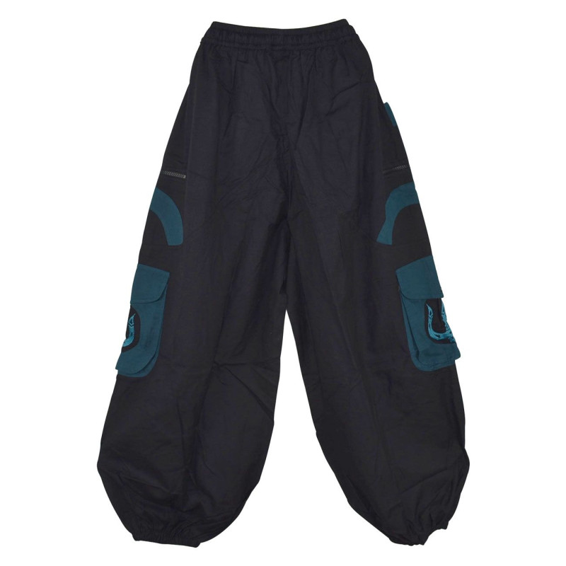 Pantalon Homme en coton artisanal avec empiècements accordées ton noir et bleu pétrole.