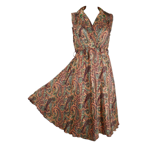 Robe mi-longue sans manche imprimée avec motif cachemire multicolore sur fond saumon en voile de polyester.