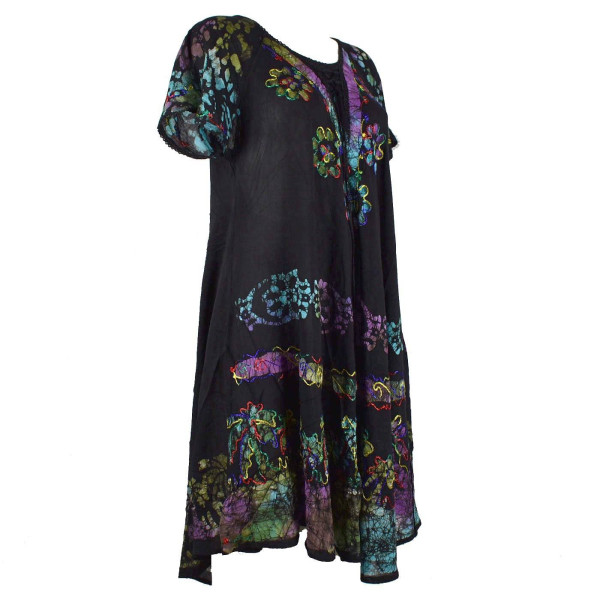 Robe grande taille fine et légère noir et batik multicolore avec petites manches.
