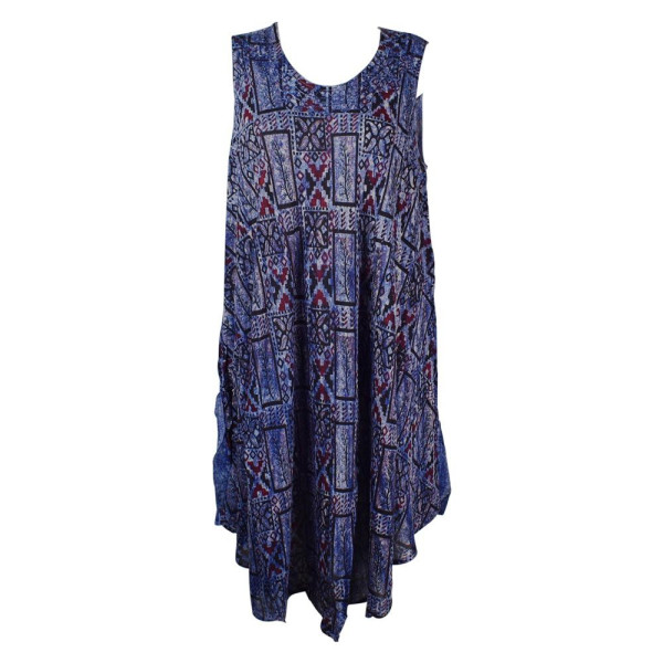 Robe courte ample sans manche en voile de viscose . C'est une robe en batik deux tons donnant un effet marbré. Un imprimé au motif graphique est sur le devant de la robe. Une encolure ronde avec de fines broderies discrètes accompagne l'imprimé noir et bordeaux.