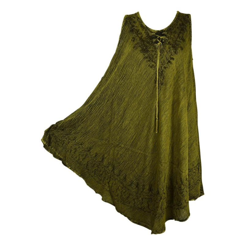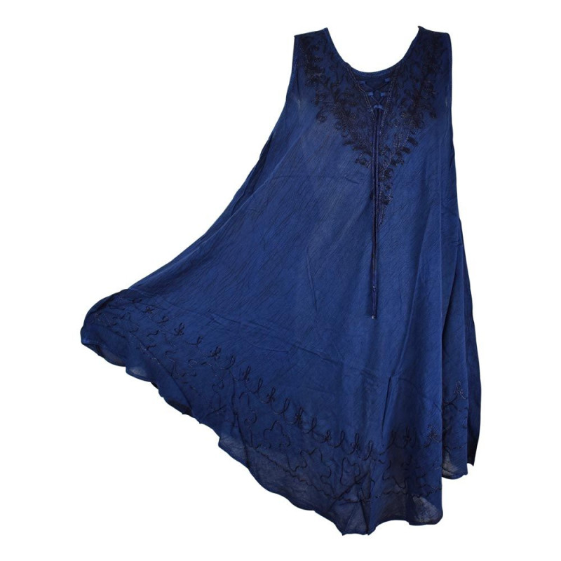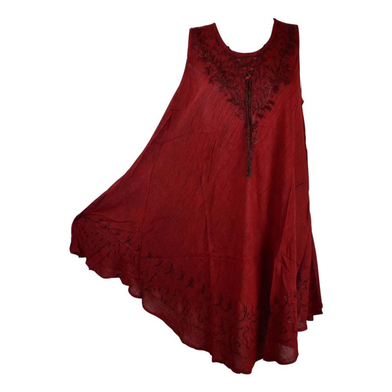 Robe courte sans manche en voile de viscose finement brodé. L'encolure ronde avec lien décoratif est monté sur un macramé fin qui décore le haut de la robe et les petites manches. Cette robe grande taille est teinté à la main deux tons, ce qui lui donne un effet marbré.