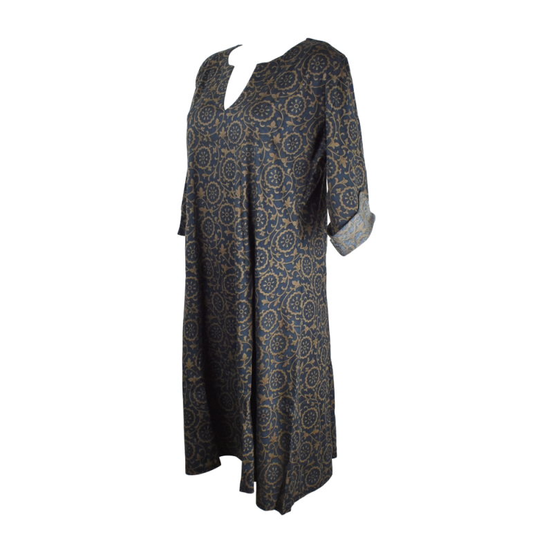 La robe midi grande taille, dotée de manches trois-quart et d'un élégant col en V, est confectionnée dans un jersey de coton imprimé aux motifs ethniques. Cette pièce allie confort et style, faisant d'elle un choix idéal pour les femmes recherchant une tenue polyvalente et flatteuse.
