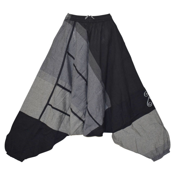 Un sarouel mixte en coton fin tramage artisanal fabriqué au Népal couleur gris deux tons et noir avec fine broderie motif triskell.