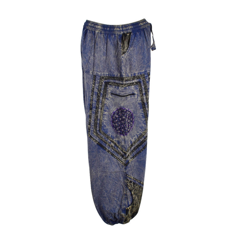 Sarouel Kalan pour homme en coton délavé avec quatre poches et broderies ethnique bleu et noir.