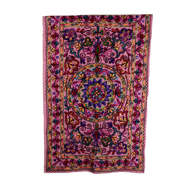 Décoration Murale et de mobiliers fait de broderies artisanales et de miroirs en provenance d'Inde de couleur rose.