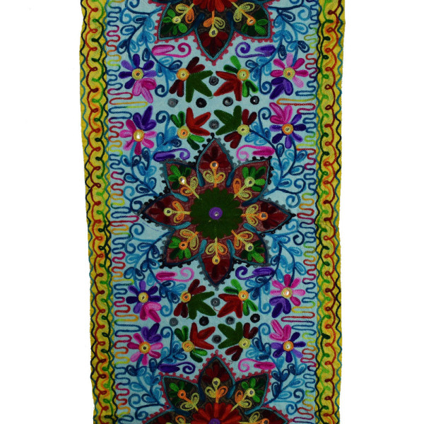 Chemin de table pour décoration murale et de mobilier fait de broderies artisanales et de miroirs en provenance d'Inde au ton turquoise avec une large bordure jaune.