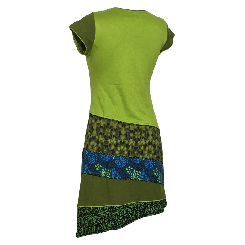 Tunique ethnique asymétrique en coton jersey vert anis avec empiècements imprimés et liserés, elle vous apportera confort et élégance toute l’année.