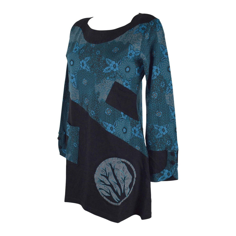 Tunique manches longues col rond en coton de jersey imprimé floral ton bleu accordé et uni noir.