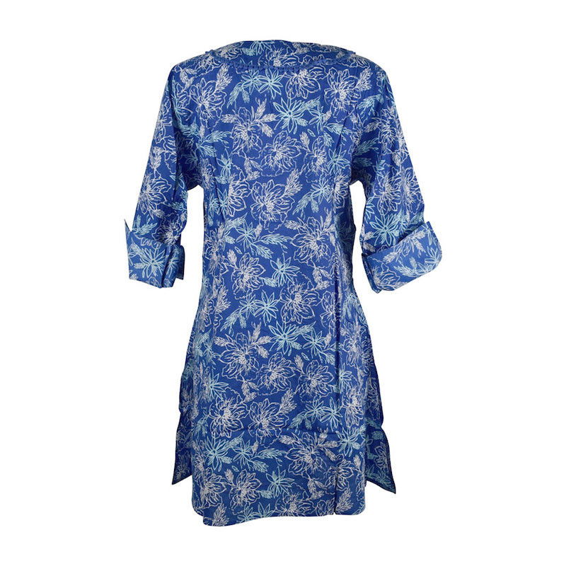 Caftan d'été en fine cotonnade douce et agréable en pur coton imprimé ton Bleu foncé et blanc.