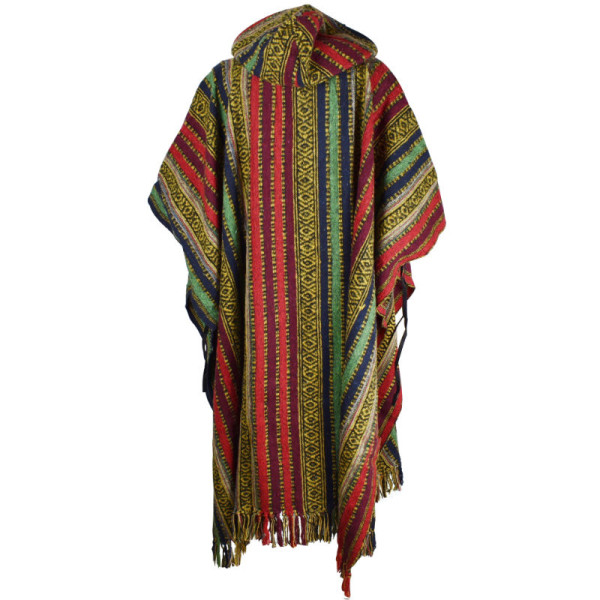 Poncho homme du Népal en coton de qualité peigné épais tissé artisanal à larges rayures multicolores bordeaux.