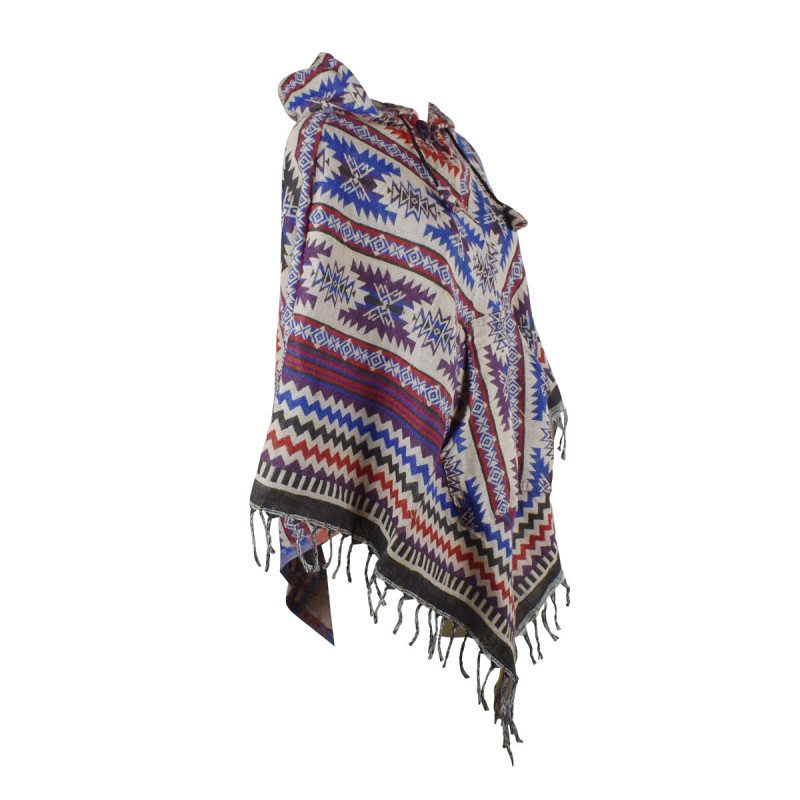 Poncho femme court à franges et capuche avec motif graphique multicolore.